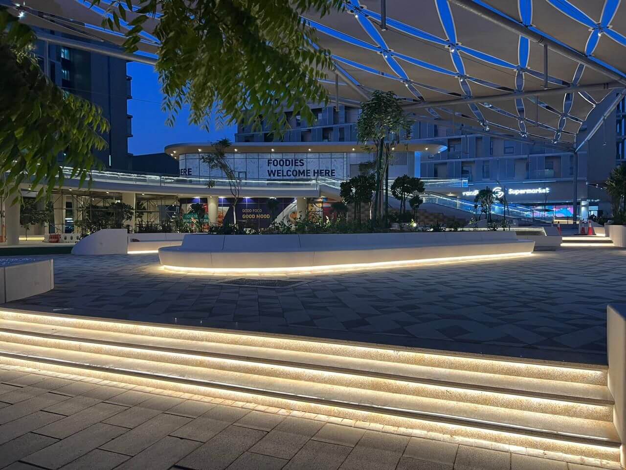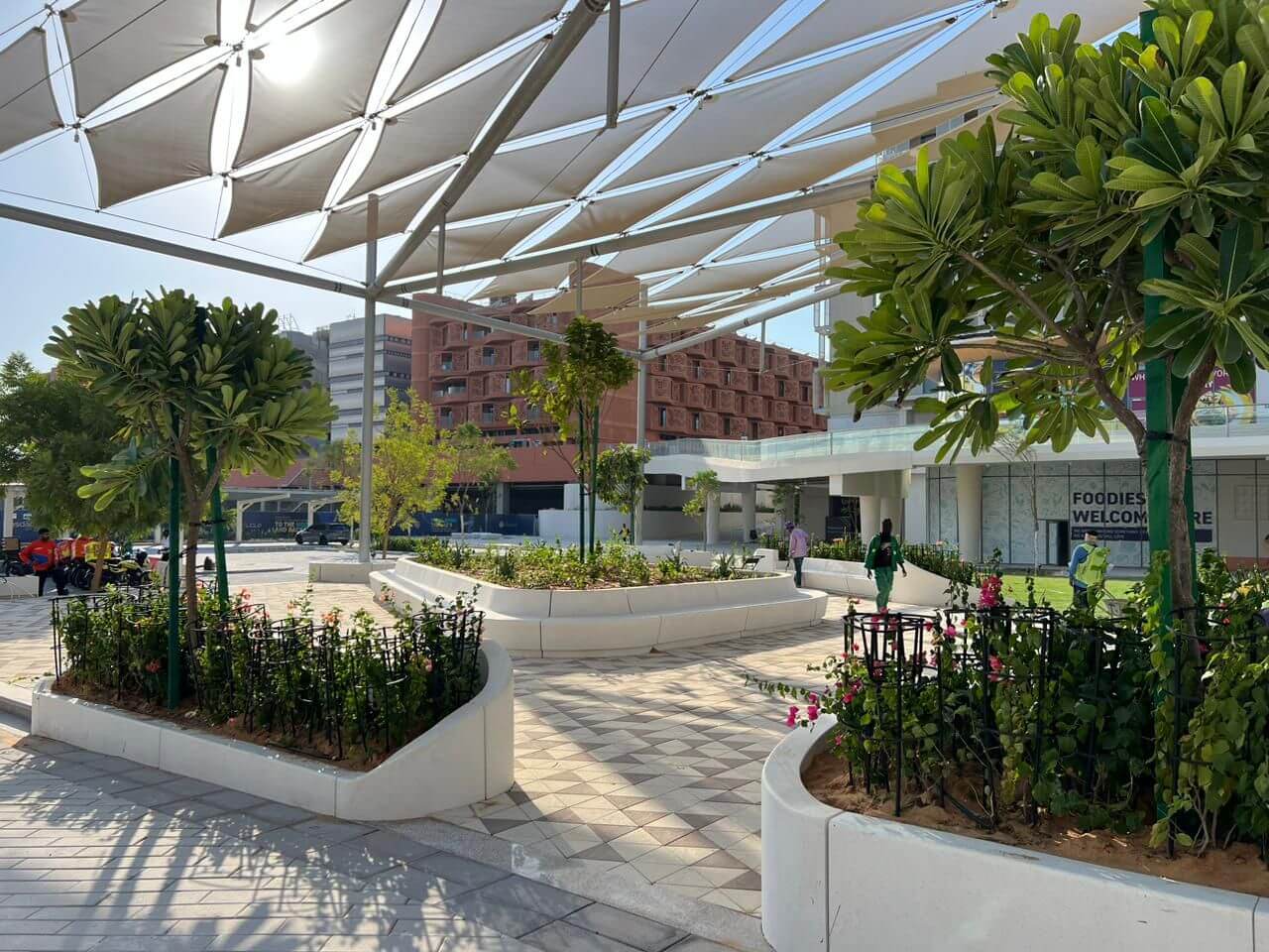 استمتع بالسكينة في ساحة إيكو بلازا الحديثة، واستمتع بصوت النافورة الهادئ وأماكن الجلوس المظللة والنباتات الخضراء الغنية. تقدم هذه الواحة الجميلة مكانًا هادئًا في قلب المدينة.