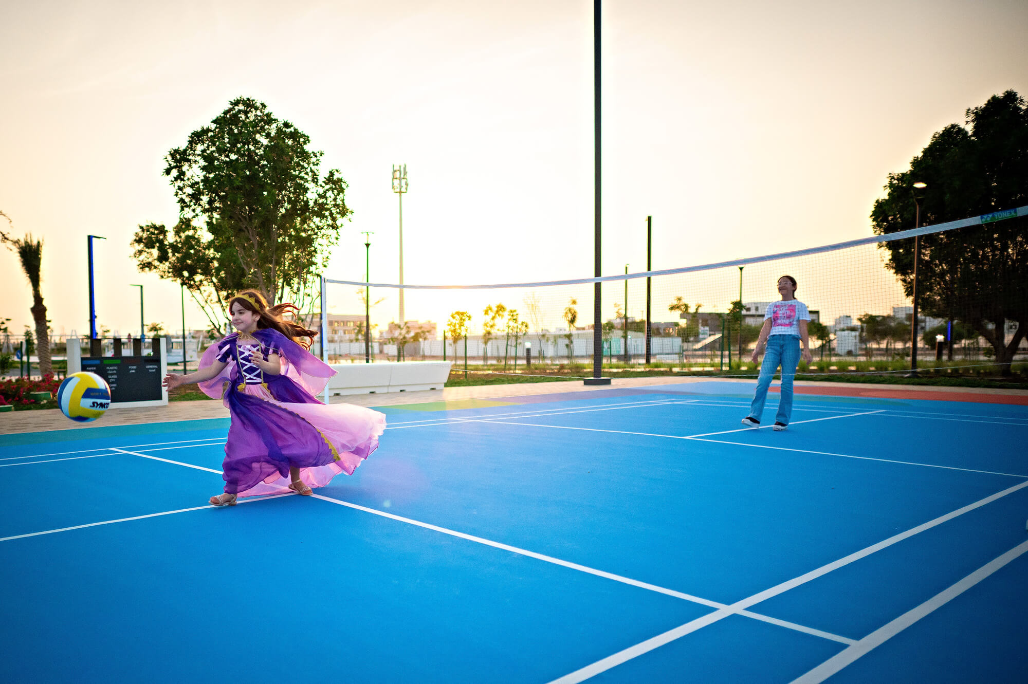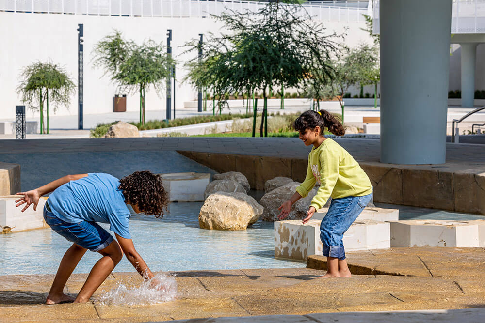 تشمل ميزات الاستدامة حدائق أفقية، وبرجاً يجمع بخار الماء من الهواء، ونظام مياه على طراز الفلج وغيرها من الميزات المائية ليستمتع الزوار بها، ومعدات اللعب التي تعمل بالحركة البشرية، ورسائل الاستدامة في جميع أنحاء الحديقة التي تشجع الأطفال على التعلم أثناء اللعب.